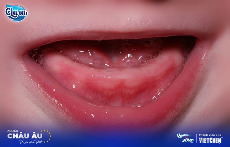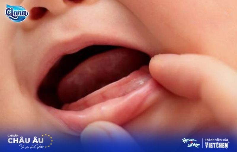 Nướu bé hơi sưng và đỏ nhẹ ở vùng răng cửa hàm dưới, có thể nhìn thấy một chấm trắng mờ (mầm răng sắp nhú).