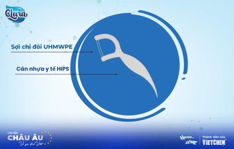 - Sợi chỉ đôi từ UHMWPE siêu bền: Điểm nổi bật của Clara Kiss là sợi chỉ đôi được làm từ UHMWPE (Ultra-High Molecular Weight Polyethylene) – một loại polyme siêu bền, chịu lực tốt và chống mài mòn cao. Thiết kế sợi đôi giúp tăng cường hiệu quả làm sạch, dễ dàng lấy đi mảng bám và thức ăn thừa mà không làm tổn thương nướu, mang lại cảm giác sạch sẽ vượt trội.