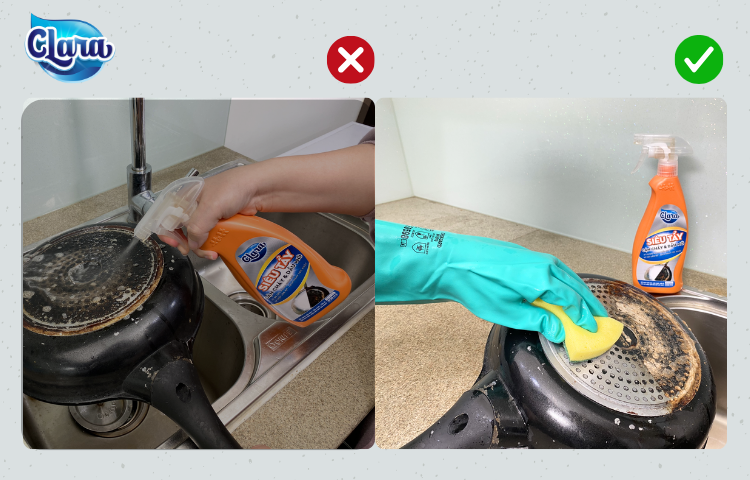 Vết cặn cháy không còn là nỗi lo khi đã có siêu phẩm Tẩy cặn cháy & dầu mỡ Clara. Với công nghệ vượt trội của CHLB Đức, Siêu tẩy cặn cháy & dầu mỡ thổi bay mạnh mẽ các vết bẩn cặn đen, cặn cháy, cặn oxi hóa và các vết cặn dầu bám lâu ngày bám trên bề mặt xoong, chảo, mặt bếp ga, bếp từ hay lưới lọc máy hút mùi. Với X5 sức mạnh thần kỳ, cho hiệu quả tác động nhanh chóng, chỉ sau 1-5 phút. Cách tiến hành như sau: