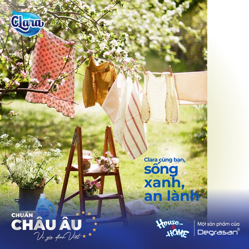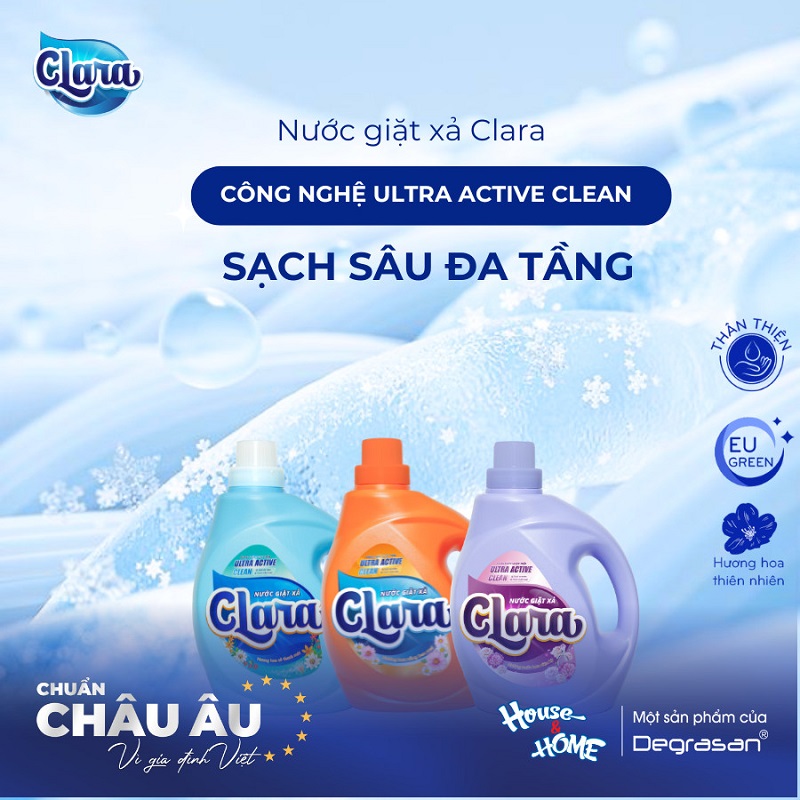 Nước giặt xả CLARA xuất xứ Châu Âu hiện đang được người tiêu dùng Việt ưa chuộng nhờ những lợi ích thiết thực, đồng hành cùng lối sống xanh và an toàn, đặc biệt phù hợp với xu hướng tiêu dùng thân thiện môi trường. Với cam kết bền vững “Clara chuẩn Châu Âu vì gia đình Việt”, thương hiệu không ngừng cải tiến để mang đến trải nghiệm giặt giũ vừa hiệu quả vừa an tâm cho mọi gia đình.