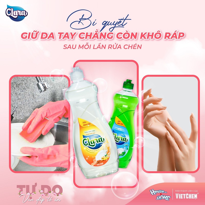 Rửa chén hàng ngày, đôi bàn tay phải tiếp xúc thường xuyên với hóa chất, dẫn đến tình trạng khô ráp, bong tróc, thậm chí là dị ứng. Hiểu được nỗi bận tâm này, Clara hương chanh đã được nghiên cứu với công thức dịu nhẹ đặc biệt, thân thiện với làn da. Thay vì cảm giác khô căng khó chịu sau mỗi lần rửa, da tay vẫn giữ được sự mềm mại, mượt mà. Đây không chỉ là một giải pháp làm sạch, mà còn là một cách để Clara đồng hành và chăm sóc đôi bàn tay mỗi người nội trợ, giúp công việc nhà không còn là gánh nặng mà trở thành một trải nghiệm thoải mái, nhẹ nhàng.