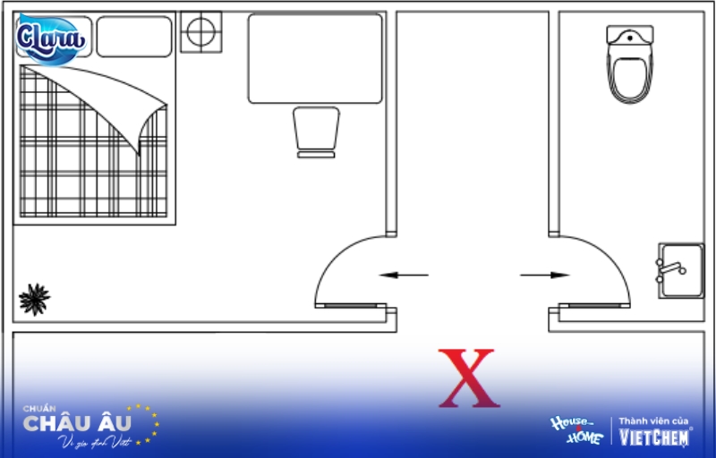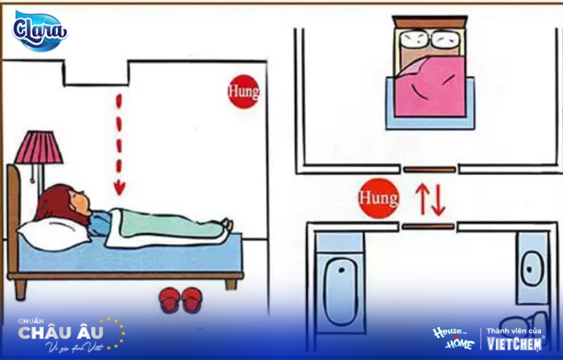 Kiêng kỵ: Phòng ngủ là nơi nghỉ ngơi, phục hồi năng lượng. Nếu đặt đối diện nhà vệ sinh, khí uế sẽ dễ dàng xâm nhập, gây ảnh hưởng xấu đến sức khỏe, giấc ngủ và tinh thần của người trong phòng.