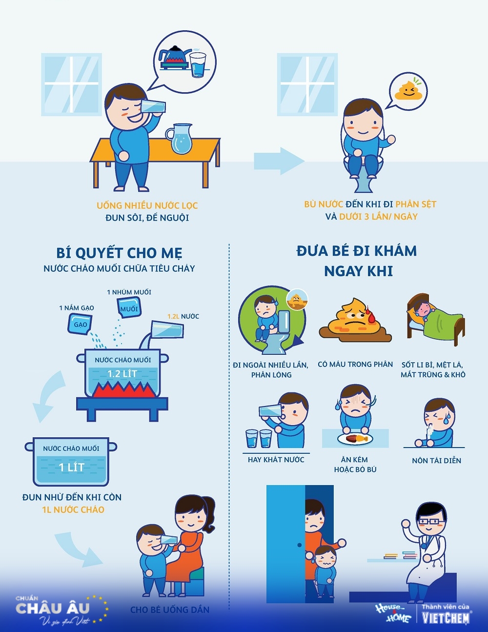 - Dùng oresol pha đúng hướng dẫn, cho trẻ uống từng thìa nhỏ thường xuyên